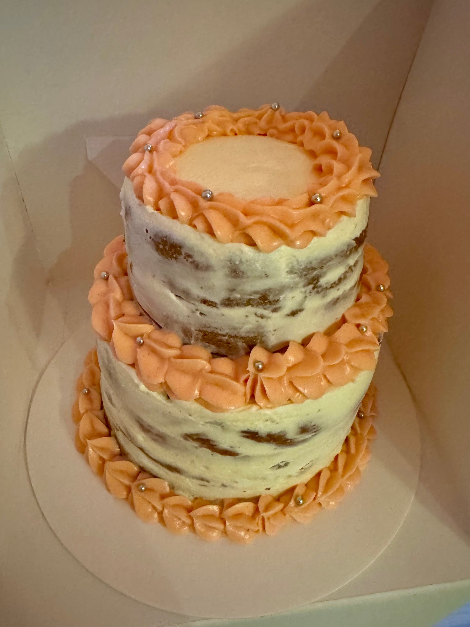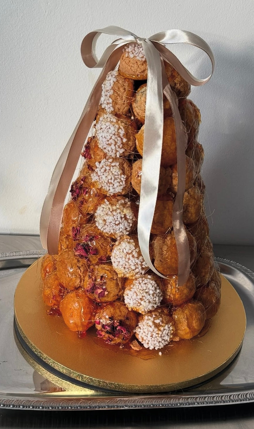 Decorations: Caramel spun sugar, sugar pearls, dried flowers & Satin ribbon