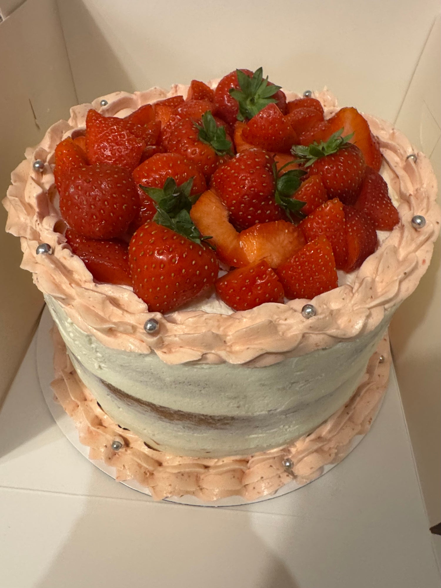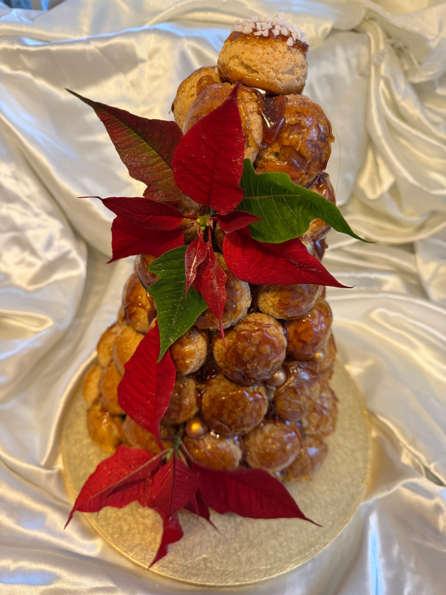 Decorations: Sugar pearls, Fresh flowers, Christmas decorations