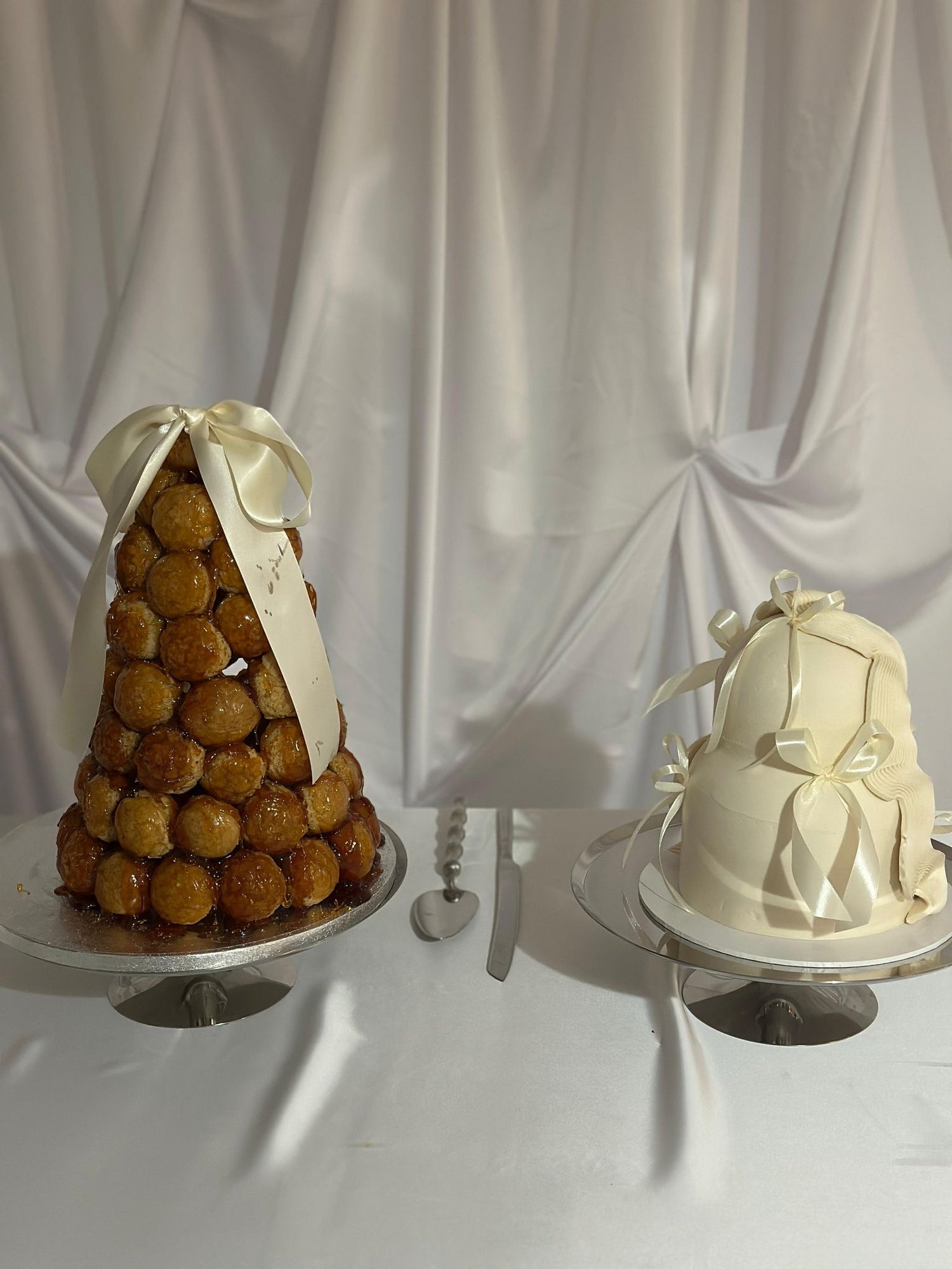 Decorations: Ivory Satin Rubbon, Caramel spun sugar